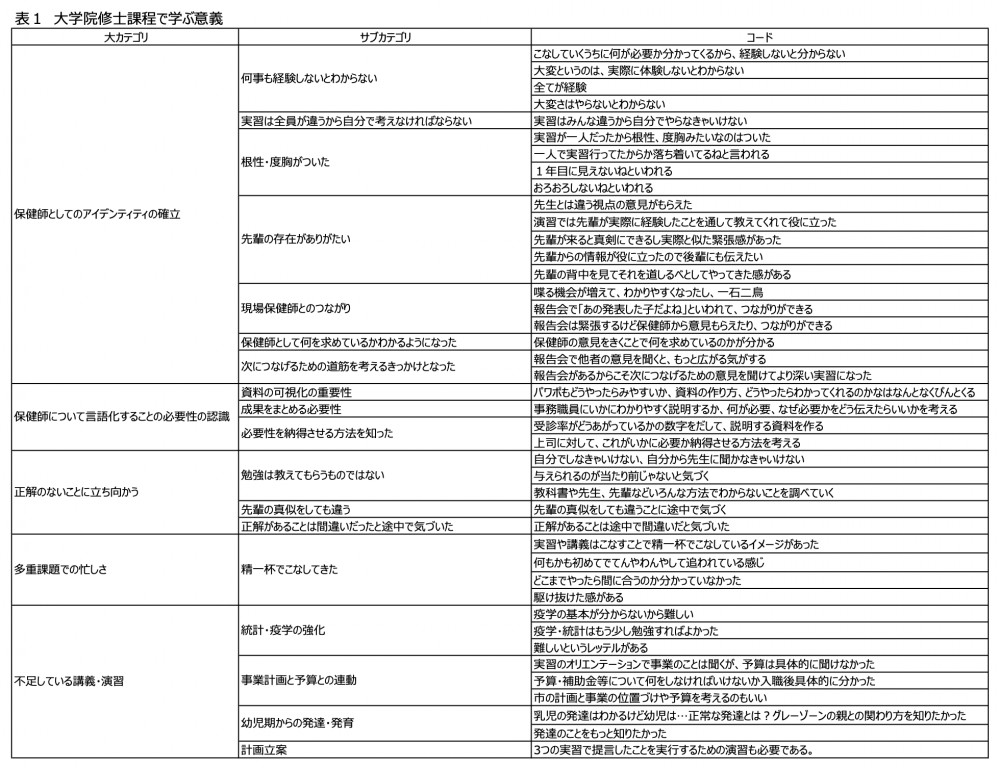 対象であった修了生は、県(1名)、市(5名)、連合会(1名)に所属していました。インタビュー内容を分析した結果、大学院修士課程で学ぶ意義として5つの《大カテゴリー》および18の【サブカテゴリー】が抽出されました。表1に結果を示します。