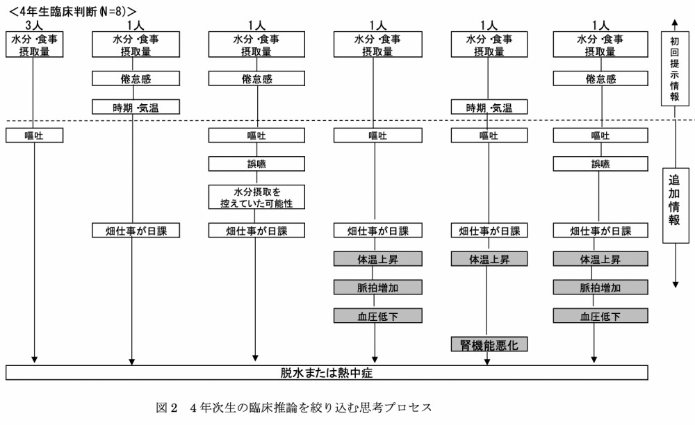 初回事例情報、追加事例情報から「脱水または熱中症」に絞り込んだ臨床推論を行った看護師、4年次生、2年次生の各々の思考プロセスを図1,図2,図3に示す。これらの結果について、以下に説明を加える。